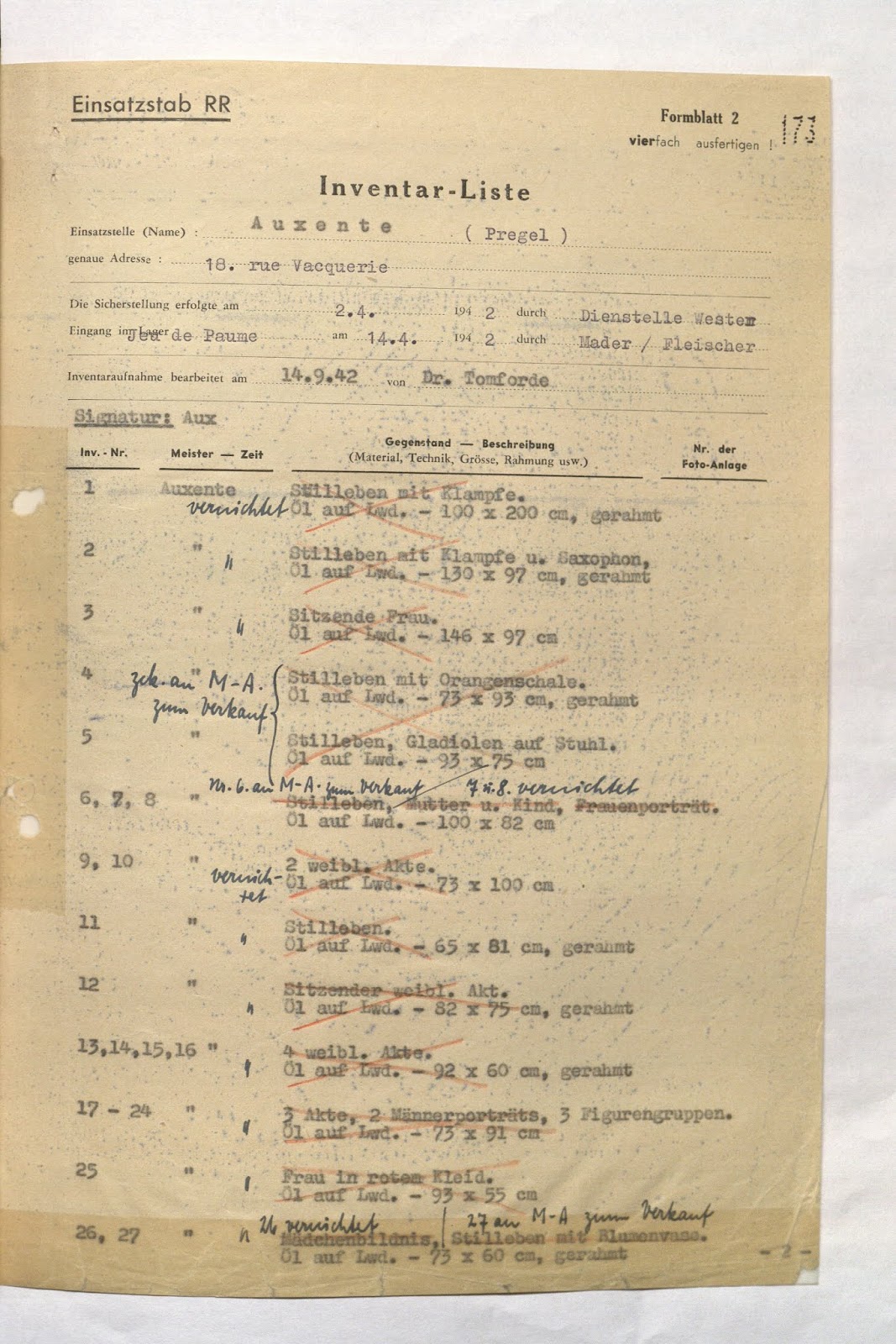 | First page of ERR inventory for AUX. Source: Bundesarchiv, B323/266 |